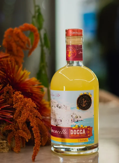 O Limoncello da Docca Distillery é produzido com cascas de limão siciliano minuciosamente selecionadas, seguindo o método tradicional da costa italiana.